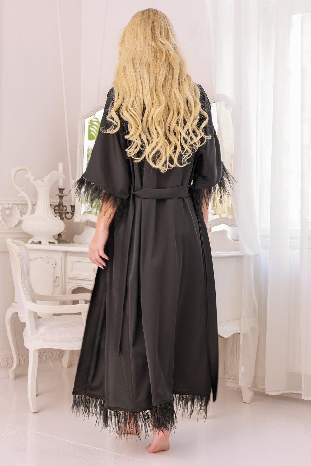 Rochie lungă și măiastră, făcută din satin care curge, care atinge și amintește de mătase. Caracterul special al rochiei Diva este accentuat de penele care împodobesc mânecile și partea de jos. Delicatețea și lejeritatea penelor fac ca acestea să te urmeze la fiecare mișcare, creând o imagine magică. Dacă cauți ceva special, ai nimerit perfect cu alegerea rochiei Diva. Îți recomandăm să completezi cu halatul Luna, care este de asemenea decorat cu pene moi. Lenjeria este ambalată într-o cutie frumoasă, mare, perfectă pentru cadou.