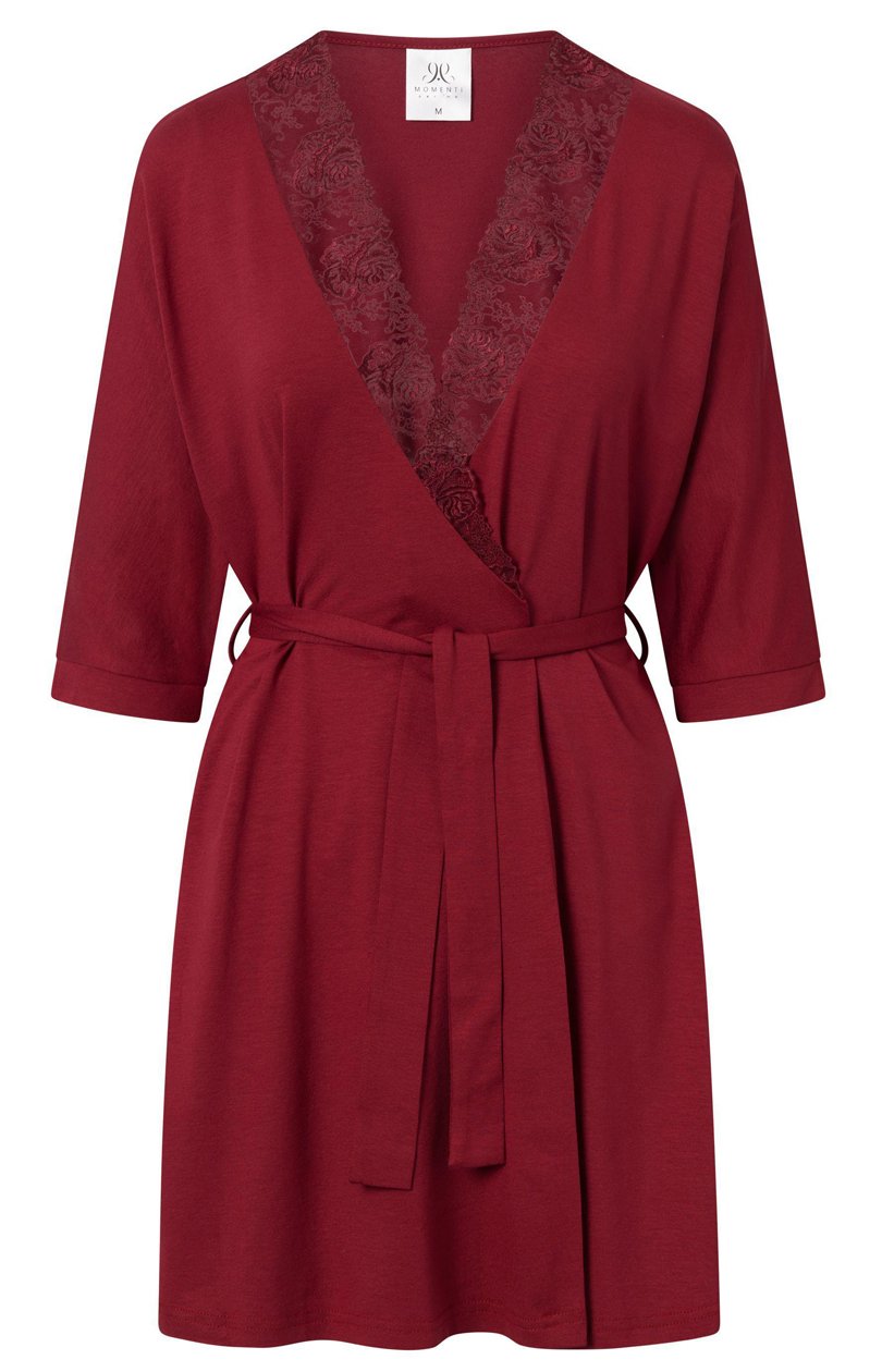 Rochie de toaletă din țesătură netedă, cu mâneci 3/4 și cravată în talie. Rochie de toaletă cu ornamente de dantelă.