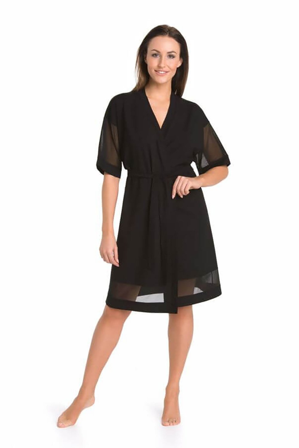 Halat pentru femei din viscoză, de înaltă calitate, de culoare neagră. Este foarte elegantă, cu o croială clasică, legată cu o curea largă și practică. Funcțională în utilizare, ușoară, aerisită și plăcută la atingere. Mâneca este în 3/4 din plasă transparentă, împodobită cu țesătură. Lungimea halatului ajunge până la genunchi și există și o inserție cusută în partea de jos a halatului, realizată dintr-o plasă cu efect transparent finisată cu țesătură. Este foarte respirabilă, nu se întinde și nu își schimbă croiala după spălare. Partea din față este împodobită cu o fustă mai largă. Aceasta oferă un confort maxim în timpul utilizării. Vă va face să vă simțiți excepțional de frumoasă. Este perfectă pentru serile și diminețile de vară, deoarece vă va înfășura corpul, dar nu vă va face să vă simțiți fierbinte. Acest halat de baie este o idee excelentă de cadou pentru o prietenă.