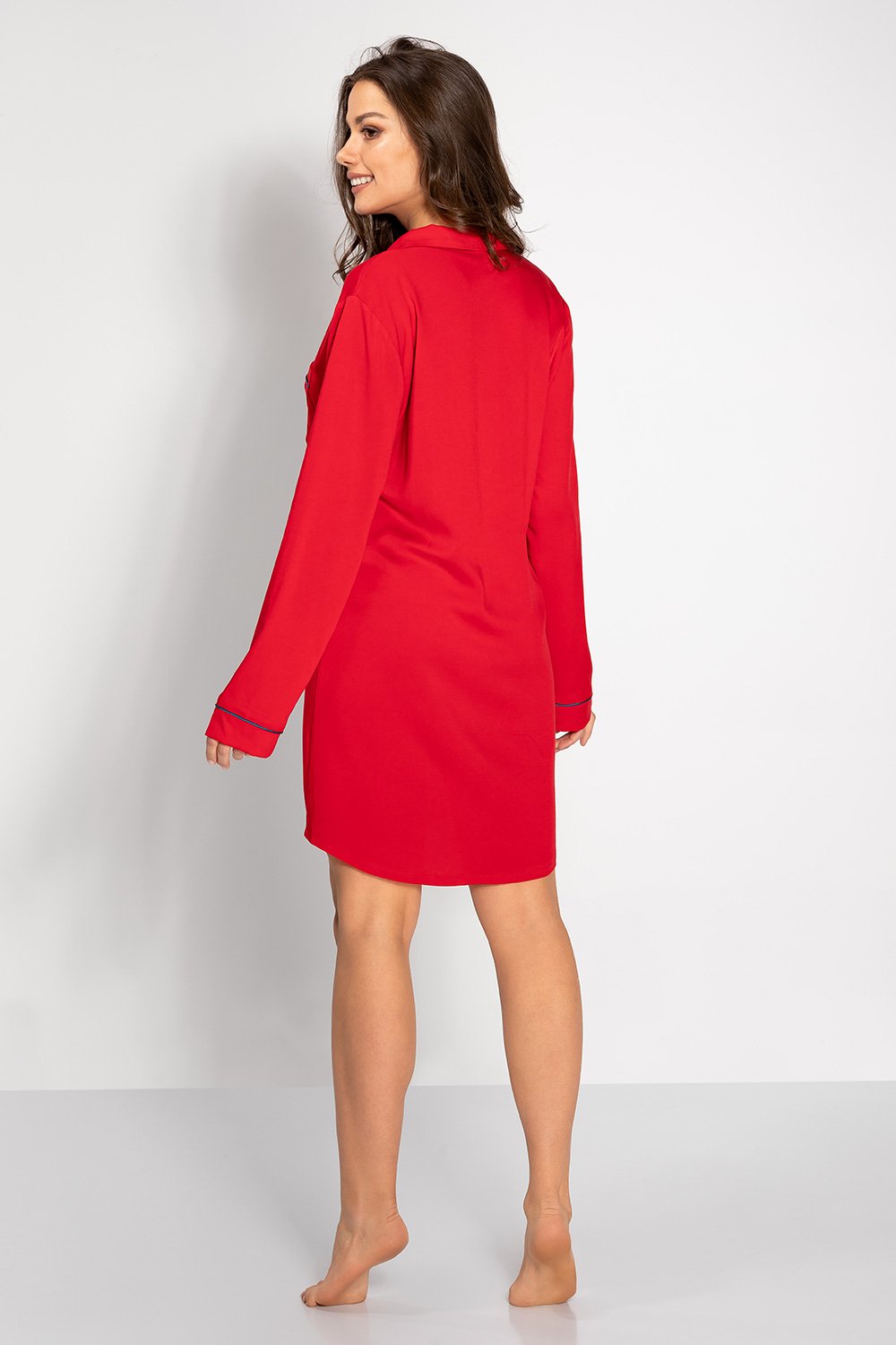Această cămașă de noapte elegantă este o combinație de confort și farmec feminin. Decolteul în V îi conferă subtilitate, iar ornamentele elegante (bordura) adaugă rafinament. Confecționată dintr-o țesătură netedă, cămașa de noapte nu este doar confortabilă, ci și delicată cu pielea, deoarece a fost creată din viscoză moale. Nasturii situați în față o fac ușor de pus și de dat jos, adăugând în același timp o notă fermecătoare. Buzunarul de la piept este un detaliu practic, iar croiul larg și confortabil o face ideală pentru a fi purtată înainte de culcare. Mâneca lungă cu manșete adaugă o notă de eleganță, iar gulerul finisat subliniază caracterul feminin. Această cămașă de noapte este, de asemenea, o idee perfectă de cadou, oferind nu doar confort, ci și un aspect elegant. Proiectată și cusută în Polonia, cu atenție la cea mai înaltă calitate.