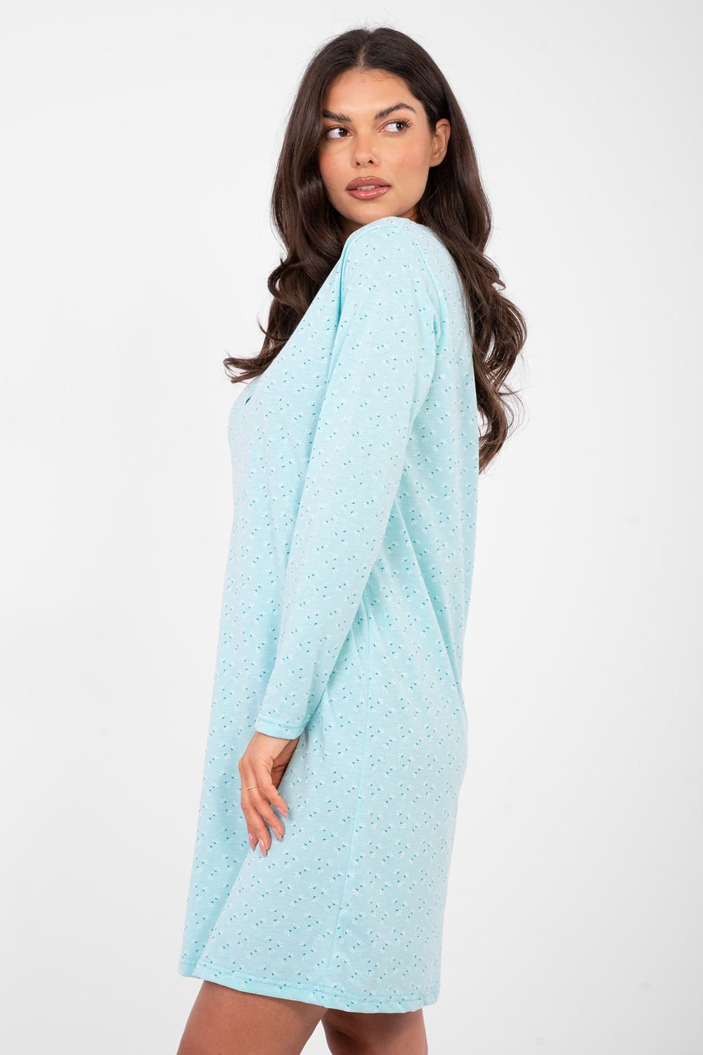 Camasa de noapte cu croiala simpla, oferind confort si libertate de miscare. Confectionata dintr-un material de inalta calitate, moale la atingere, care este respirabil si prietenos cu pielea. Model cu un imprimeu dominant, conferind un caracter subtil intregii piese. Gat rotund inchis cu patru nasturi in fata adauga practicitate si farmec delicat. Manecile lungi fac ca camasa sa fie ideala si pentru serile mai racoroase. Lungimea pana deasupra genunchilor garanteaza confortul purtarii si un aspect clasic.