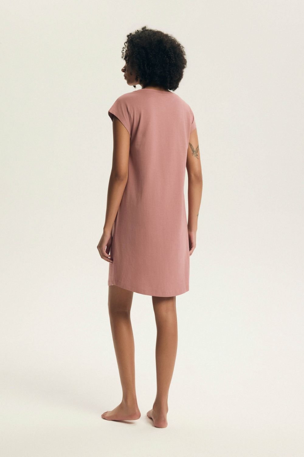 Camasa de noapte eleganta cu maneci scurte, care imbina confortul cu un caracter delicat si feminin. Croiala lejera si confortabila ofera libertate de miscare, iar paleta de culori subtila confera intregii tinute un aspect proaspat si elegant. Modelul are decolteu rotund si lungime pana la genunchi, ceea ce il face usor si confortabil de purtat. Camasa este decorata cu un imprimeu pe partea din fata, conferindu-i un aspect modern si atragator, iar taieturile laterale adauga stil si libertate de miscare. O propunere ideala pentru femeile care apreciaza combinatia de confort, lejeritate si detalii delicate.