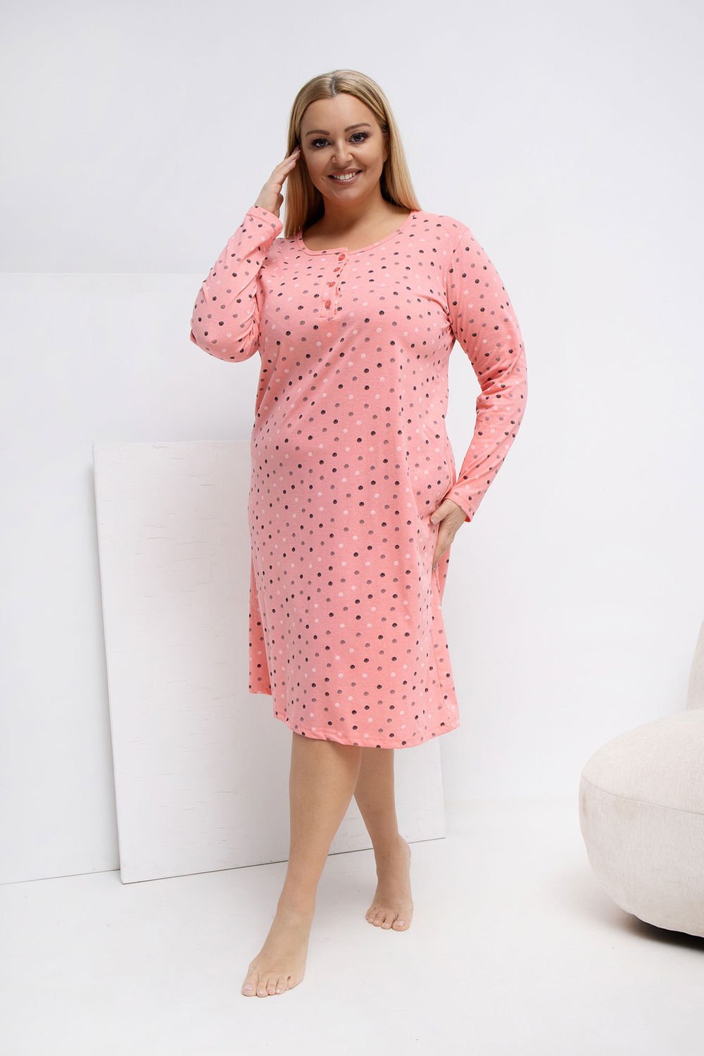 O cămașă de noapte confortabilă și stilată de mărime mare, în care domnesc punctele adorabile, conferind întregului un aer ușor și feminin. Modelul este realizat în principal dintr-un material moale și plăcut la atingere din bumbac, asigurând confortul în timpul somnului și purtarea confortabilă. Cămașa are un decolteu clasic, rotund și mâneci lungi care protejează împotriva frigului. În față sunt amplasate patru nasturi subtili, adăugând un detaliu delicat și ușurând îmbrăcarea. Lungimea până la genunchi face ca cămașa să fie elegantă și lejeră în același timp. Lipsa închiderii conferă modelului ușurință și simplitate, perfectă pentru relaxare acasă.