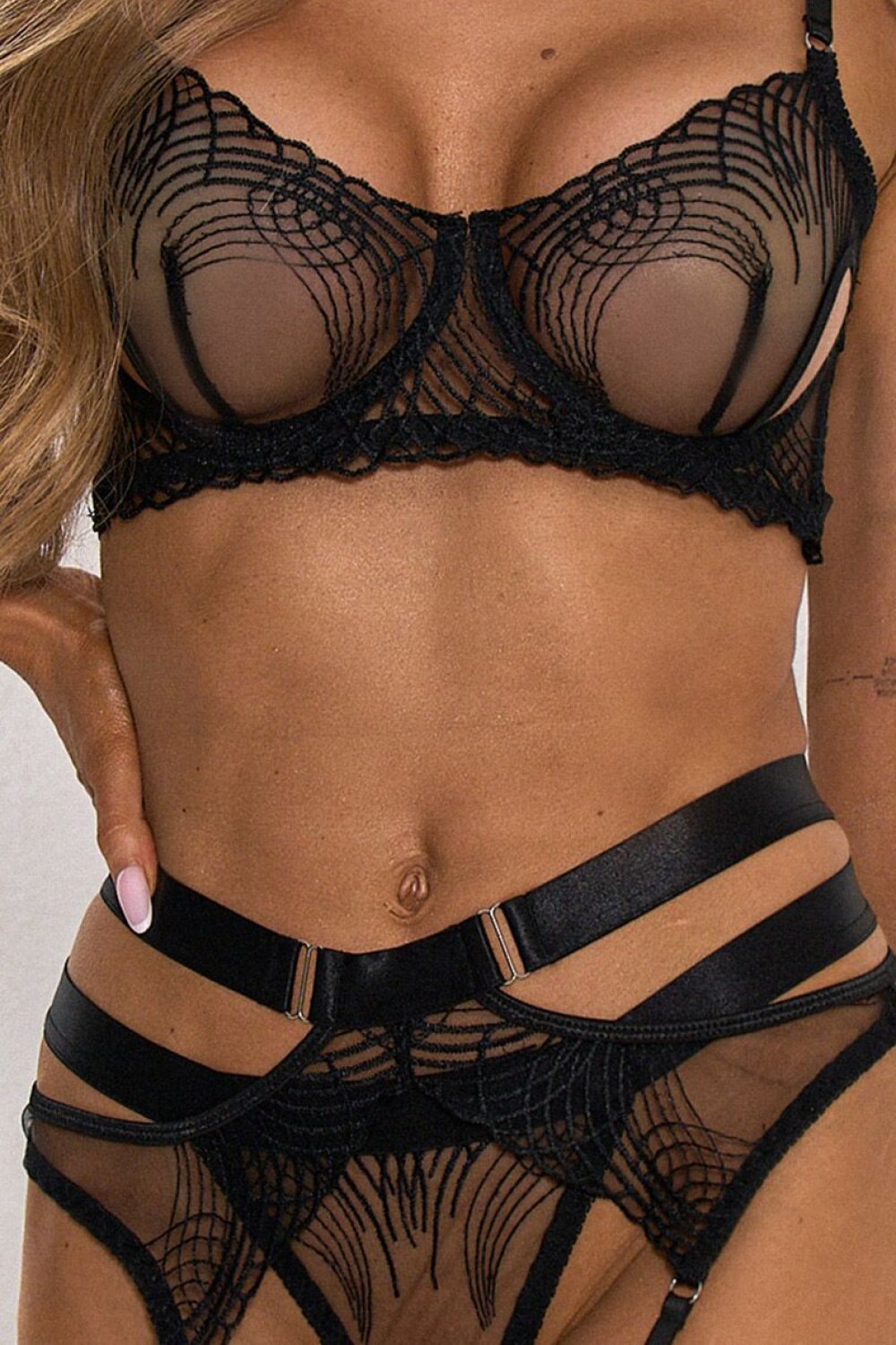Negru, set de damă cu dantelă cu 4 piese DIVA NIGHT este un set extrem de senzual și spectaculos, în care dantela sofisticată se întâlnește cu detalii moderne și un design îndrăzneț. Creat pentru femeile care doresc să-și sublinieze încrederea în sine, rafinamentul și frumusețea siluetei lor. Dantela delicată și minuțios realizată combinată cu elemente transparente creează o întregime spectaculoasă, atrăgătoare și uimitoare încă de la prima vedere. Sutienul tip soft subliniază subtil linia naturală a sânului, iar bretelele reglabile și benzile de pe spate permit un ajustare perfectă. Centura pentru ciorapi subliniază cu efect talia și șoldurile, combinând perfect cu chilotul asortat. Elementele decorative, detașabile, de legături pentru coapse completează setul, oferind posibilitatea de a-l adapta pentru diferite ocazii și stiluri. DIVA NIGHT este un set pentru femeile care doresc să se simtă deosebit, îndrăznețe și absolut feminin. Ideal pentru ocazii speciale și ca element de lux în garderobă, care adaugă încredere și subliniază frumos orice atu al siluetei. Fiecare model Pure Sin este realizat din materiale de înaltă calitate, cu atenție la cele mai mici detalii, pentru o potrivire perfectă cu silueta feminină și o finisare precisă. Este lenjerie care uimește prin formă și oferă confort la purtare, pentru că senzualitatea merită o execuție perfectă.