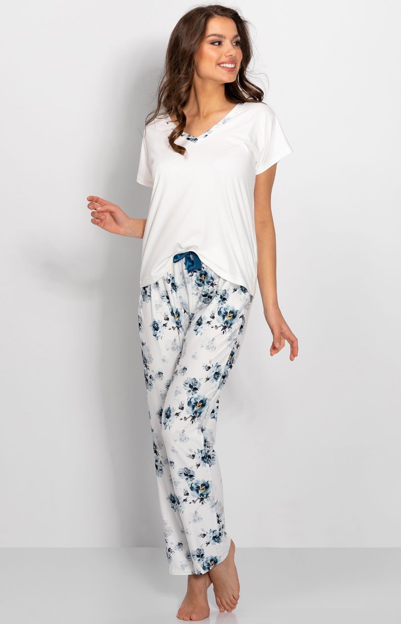 Pijama de damă formată dintr-o bluză și pantaloni. Bluză cu mâneci scurte, cu decolteu ascuțit. Pantaloni lungi, fără buzunare, cu o fundă decorativă în talie. De asemenea, este ideal ca îmbrăcăminte de casă.