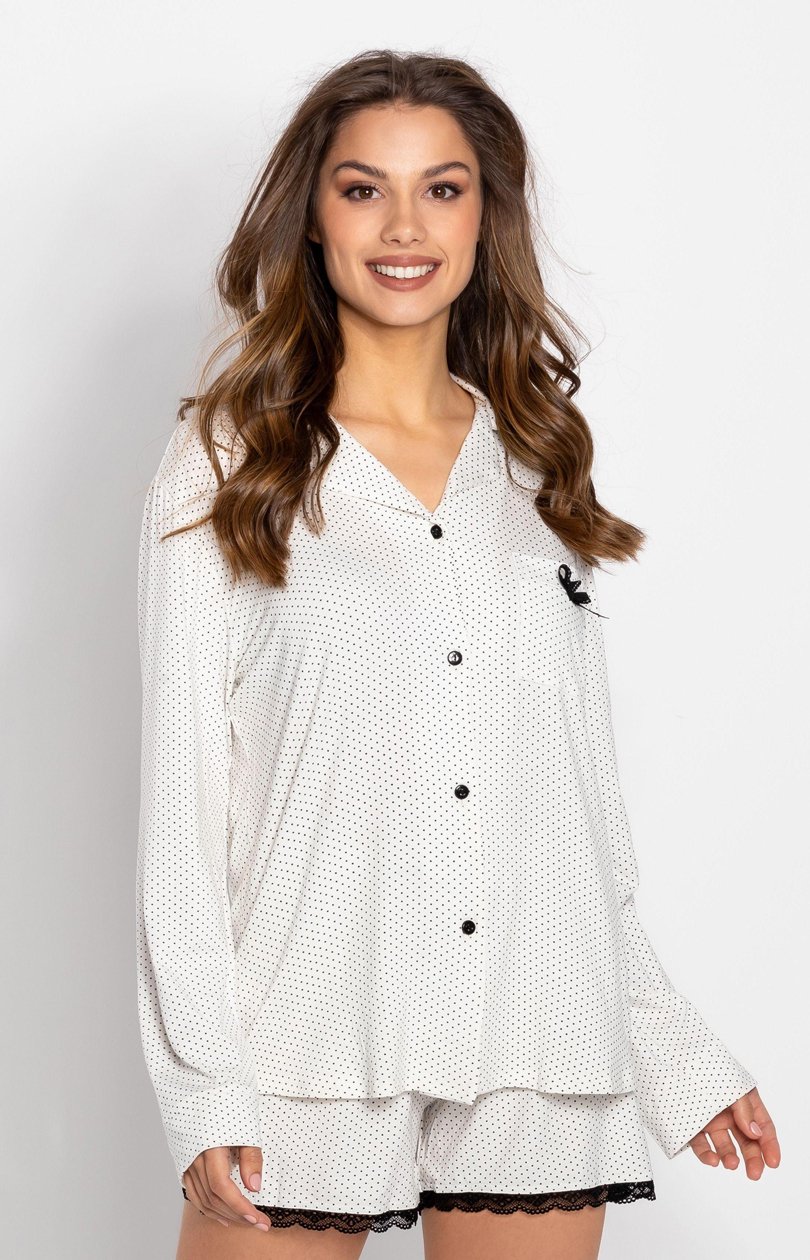 Pijama de damă formată dintr-o cămașă și pantaloni scurți. Cămașă cu mânecă lungă, cu mânecă lungă și buzunar în față. Pantaloni scurți cu croială lejeră, confortabilă, cu dantelă decorativă.
