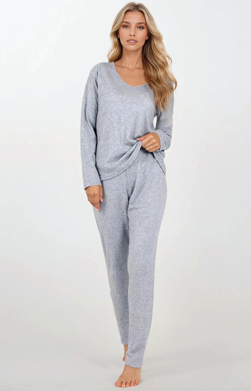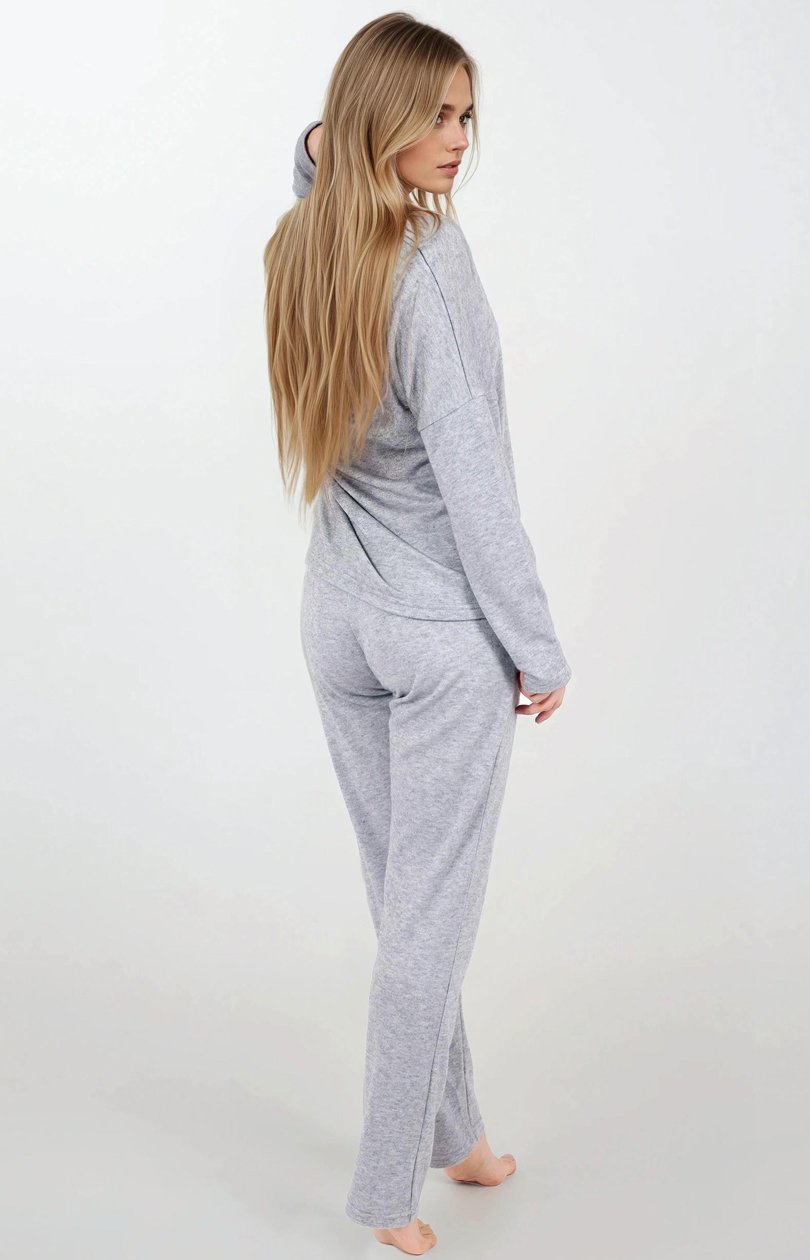 Pijama de damă cu 2 piese, care combină eleganța cu confortul maxim. Bluza cu mâneci lungi și decolteu în formă de V este proiectată într-o croială lejeră de tip oversize, ceea ce o face o alegere excelentă pentru femeile cu un bust mai mare, asigurând libertate și confort în purtare. Materialul neted într-o paletă delicată de culori adaugă subtilitate și clasă, ceea ce face ca pijama să fie potrivită și ca homewear elegant. Pantalonii cu picioare lungi și croială slim subliniază silueta, iar banda elastică în talie asigură o potrivire perfectă pentru orice figură. Lipsa buzunarelor le conferă un caracter minimalist. Materialul delicat de înaltă calitate garantează durabilitate și plăcere în utilizare, creând o întregire armonioasă cu bluza. Croiala elegantă și regular fit fac acest set o alegere ideală pentru femeile care apreciază confortul, stilul și versatilitatea.