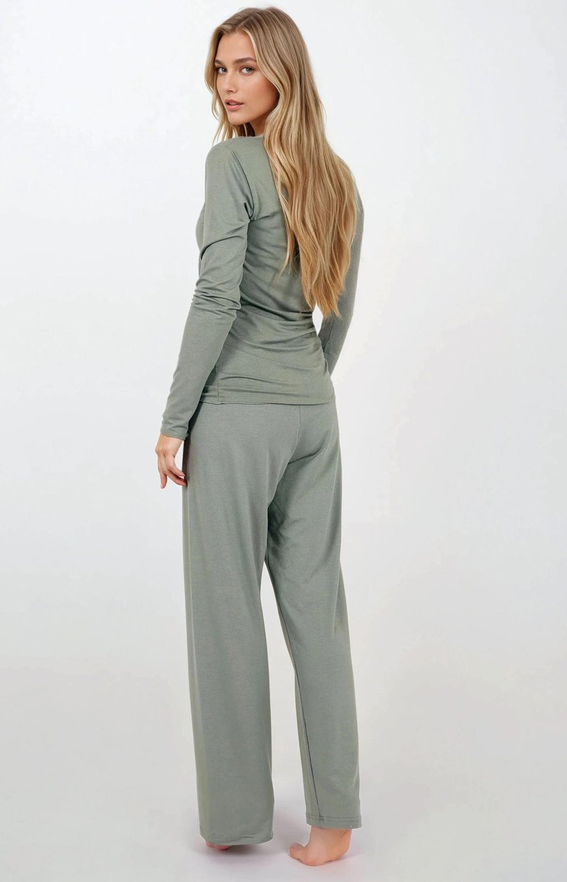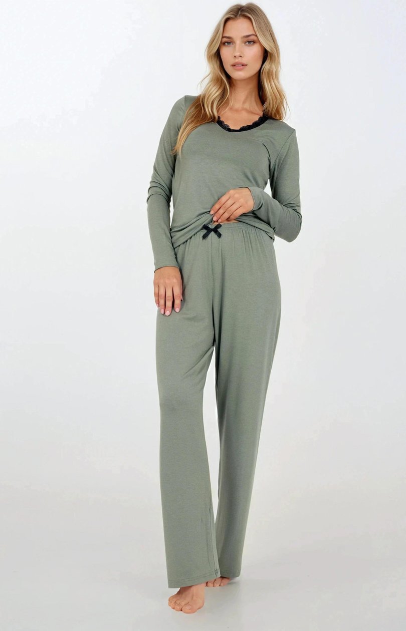 Pijamale două piese, proiectate cu eleganță și confort în minte. Decolteu în vârf, subtil finisat cu dantelă, îi adaugă farmec feminin și ușurință. Paleta de culori delicate și materialul neted formează o întreg unitar, perfect pentru odihnă și relaxare. Partea de sus a pijamalei cu mâneci lungi finisată cu manșetă elegantă asigură confort și stil, iar pantalonii fără buzunare, cu croială simplă și elastic în talie, garantează confort și libertate de mișcare. Pantalonii lungi asigură confort în nopțile mai reci, iar materialul moale și respirabil din viscoză delicată oferă senzația de ușurință și confort pe tot parcursul nopții. Pijamaua este proiectată și cusută în Polonia din materiale de cea mai înaltă calitate, ceea ce o face o alegere excelentă pentru cadou sau ca homewear elegant.