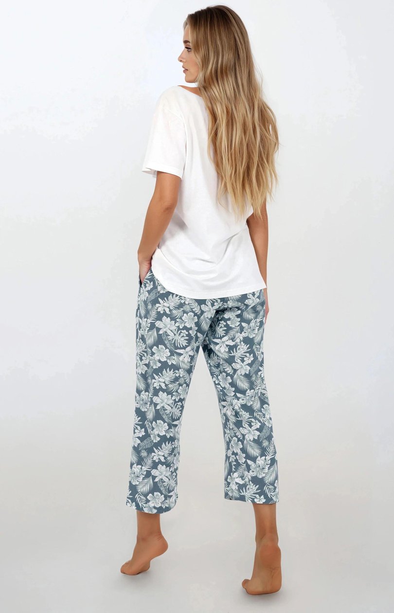 Pijama de damă în 2 piese este o combinație între stilul feminin, confort și eleganță subtilă. Proiectată și cusută în Polonia dintr-un material delicat și moale de înaltă calitate cu un imprimeu, se potrivește perfect nu doar ca lenjerie de noapte, ci și ca homewear confortabil. Partea de sus a pijamalei are croială lejeră cu mâneci scurte și decolteu semicircular, care subliniază ușor gâtul, conferindu-i o ținută lejeră. Pantalonii cu croială oversize au picioare drepte și late, cu o elastică confortabilă în talie care asigură libertate maximă de mișcare, iar buzunarele practice de pe laterale adaugă funcționalitate. Culoarea delicată și stilul feminin și elegant fac ca pijama să arate stilat și subtil. Materialul respirabil și plăcut la atingere garantează confort termic și o stare de bine excelentă pe tot parcursul nopții și diminețile leneșe acasă. Este alegerea ideală pentru femeile care apreciază confortul fără a renunța la un stil bun. Compoziție: Partea de sus: 92% viscoză, 8% elastan, Partea de jos: 100% viscoză.